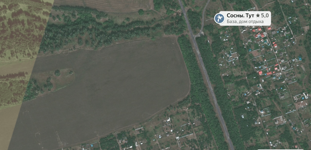 Дальше есть турбаза в 200 метрах от Сергеевских усадеб. С концептуальным названием «Сосны.Тут». Домиков — два. Тихий эскапистский отдых, оценка на Яндексе, как и принято в «нашем» регионе — 5. На фото видно, что у нас общий съезд с дороги, только в разные стороны.